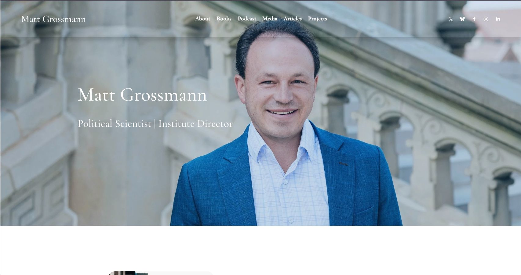 Website for Political Science professor and author Matt Grossmann. https://mattg.org